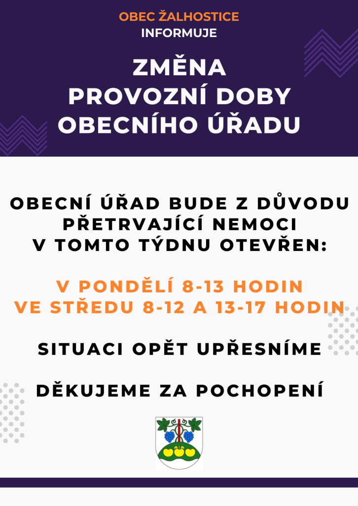 Dovolujeme si upozornit občany, že z důvodu přetrvávající nemoci bude úřad v tomto týdnu otevřen pouze dnes do 13 a ve středu do 17 hodin. Děkujeme za pochopení.