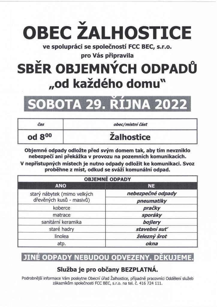 V sobotu 29. října 2022 od 8 hodin proběhne v obci sběr objemných odpadů. Objemné odpady odložte před svým domem, tak aby tím nevzniklo nebezpečí nebo překážka v provozu. Svoz proběhne z míst, odkud se sváží komunální odpad.