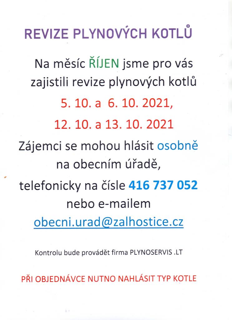 5.10.,6.10.,12.10.,13.10.2021. Zájemci se mohou hlásit na obecním úřadě. Při objednávce nutno nahlásit typ kotle. Kontrolu bude provádět p. Neubert - Plynoservis.LT.