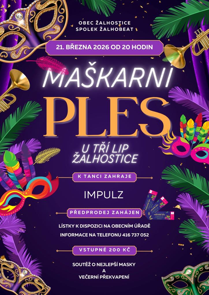 Obec Žalhostice a Žalhobeat Vás srdečně zvou na tradiční MAŠKARNÍ PLES 21.3.2026 od 20:00 na sále U tří lip.