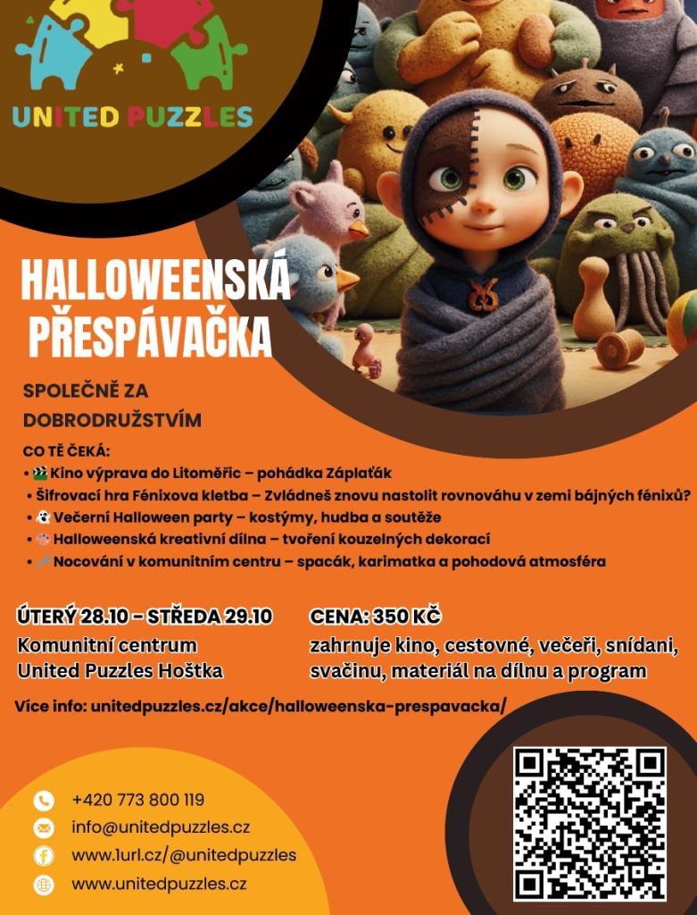 Připravte se na nezapomenutelnou hallowenskou přespávačku. V rámci akce budete mít možnost vychutnat si kino výpravu do Litoměřic, kde shlédnete pohádku Záplaťák. Dále se zúčastníte šifrovací hry Fénixova kletba, která prověří vaše dovednosti. Večer se můžete těšit na Halloween party s kostýmy, hudbou a soutěžemi, a také na kreativní dílnu, kde si vyrobíte vlastní dekorace. Akce se koná v komunitním centru United Puzzles Hoštka, Petra Bezruče 232 a zahrnuje nocování, večeři, snídani a další občerstvení.