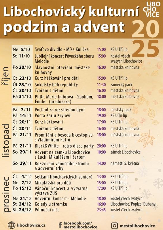 Přijďte si užít kulturní podzim a advent v Libochovicích. Od října až do Vánoc vás čeká spousta akcí pro děti i dospělé. Užijte si divadelní představení, koncerty, tvořivé dílny, besedy, tradiční rozsvícení vánočního stromu nebo oblíbenou mikulášskou nadílku pro děti. ✨